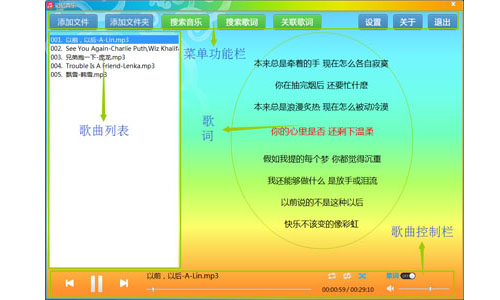 直观的歌曲控制栏,简易的菜单功能栏,一目了然