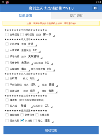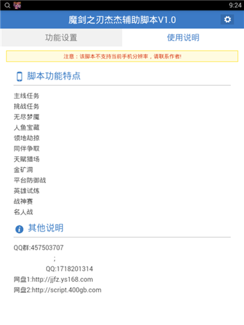 魔剑之刃杰杰辅助脚本 v1.0 永久版带测试 使用魔剑之刃杰杰辅助脚本时首先注意手机或模拟器的分辨率,一般为720*1280,其次设备需要root,否则无法使用,最后在开启辅助后,会显示浮窗,玩家可以通过浮窗设置辅助功能及相关事项。