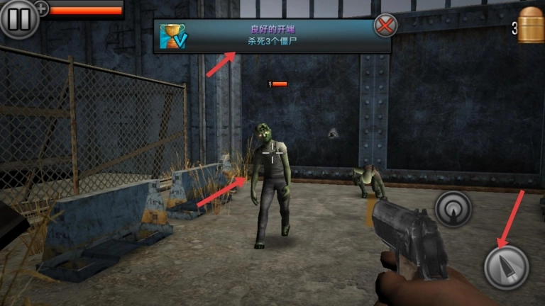 3、在战斗过程里,达成杀死3个僵尸的目标后,将会弹出“良好的开端”这一提示,随后继续与剩余的僵尸展开战斗。