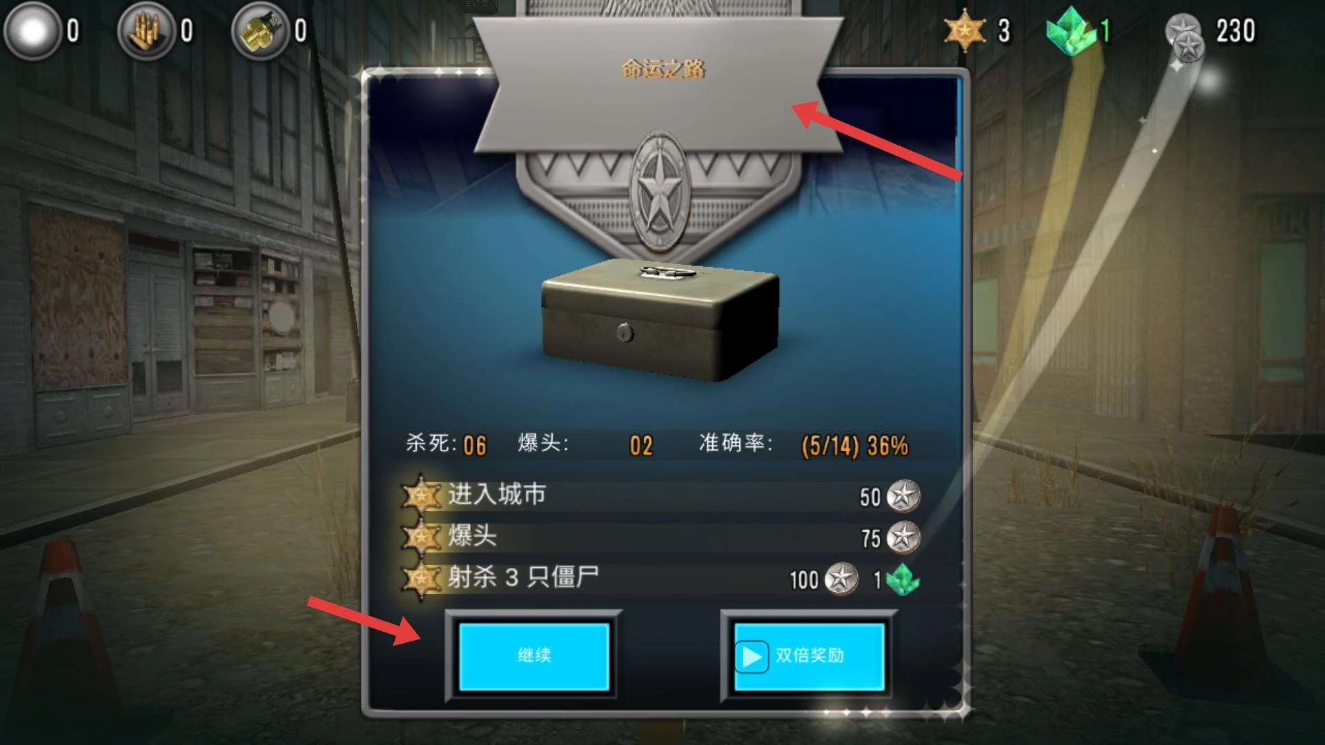 4、在命运之路结算界面显示时,会呈现诸如杀死僵尸数量、爆头数等数据,此时可点击“继续”开启下一段冒险。