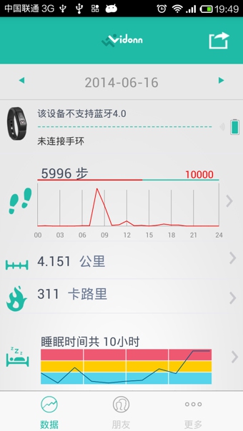 “唯动(Vidonn)”--智能手环是一款可穿戴式智能设备,内含三维动态感应器、振动马达等。用户通过佩戴这款手环,可以记录日常生活中的锻炼、睡眠等实时数据。该手环可以与智能手机或PC通过蓝牙无线同步,起到通过数据引导健康生活方式的作用。用户可以通过手机应用随时查看,了解自己的运动及睡眠数据,并可以分享数据、还可以通过加好友进行互动。用户的运动数据还能获得积分,积分用于和好友PK以及换取礼物、抽奖等,让运动趣味化、娱乐化。【软件特点】