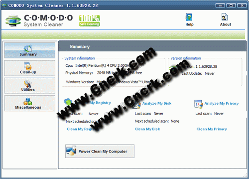 COMODO System Cleaner V3.0 英文官方安装版 COMODO出品的系统设置优化和清理程序,包括注册表和磁盘清理,浏览器和即时通讯软件以及其他系统应用软件产生的缓存文件、历史记录等隐私信息清理,还包括文件和文件夹加密工具,文件分割工具、哈希值计算工具、文件内容比较工具……等有用的小工具
