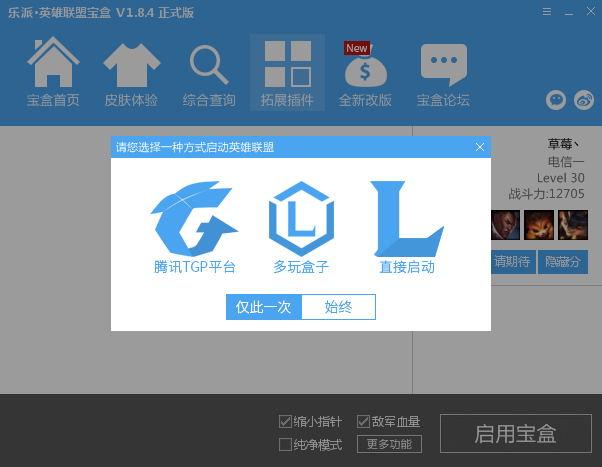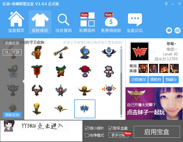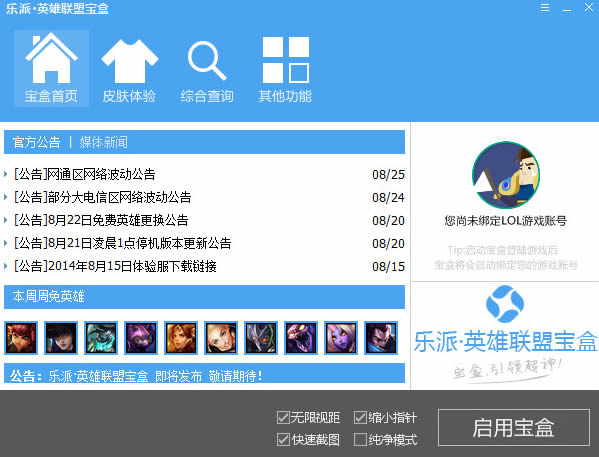 lol乐派盒子功能类似多玩LOL盒子,支持技能CD显示,数字显血,防御塔攻击范围,补刀提示,英雄换肤,守卫眼皮肤切换,战绩记录查询、战斗力评估等实用功能。作为腾讯官方助手功能的补偿和增强,lol乐派盒子不提供任何破坏游戏平衡,损害玩家和官方利益的功能,是您游戏的绝佳选择。