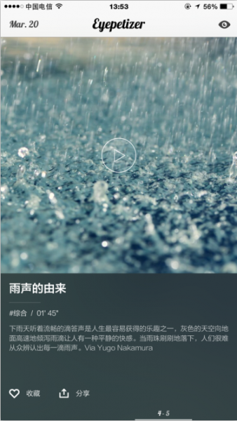 开眼的整体设计很轻很有范,翻页的动效设计在整体简洁的设计上添彩不少,列表与详情页之间的转场动画非常自然顺畅。与那些极富视觉享受的短视频相比,开眼作为载体整体设计也让人非常喜欢。