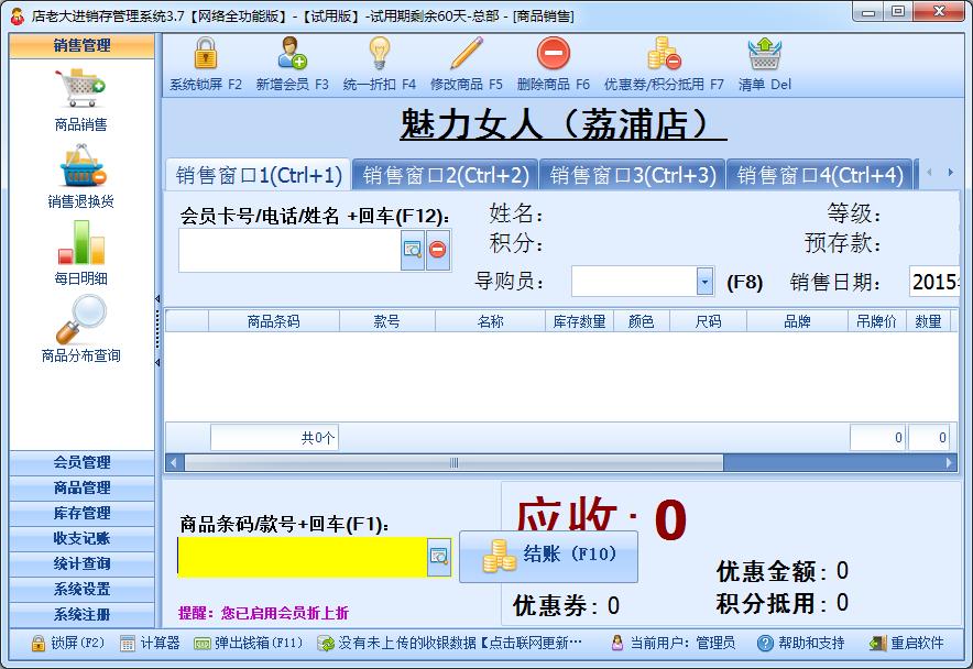 店老大服装店进销存管理软件专门针对服装销售行业开发设计,帮助你进行多仓库(门店)联网连锁管理、会员信息共享、远程管理店铺,全球任何可以上网的地方都可以联网连锁和管理店铺!支持扫描枪、小票打印机,钱箱,条码打印机,顾客显示屏,盘点机等硬件,特别适用于服装店,鞋帽店,箱包皮具店,内衣店等用于销售收银、会员管理、库存管理、员工业绩提成等。