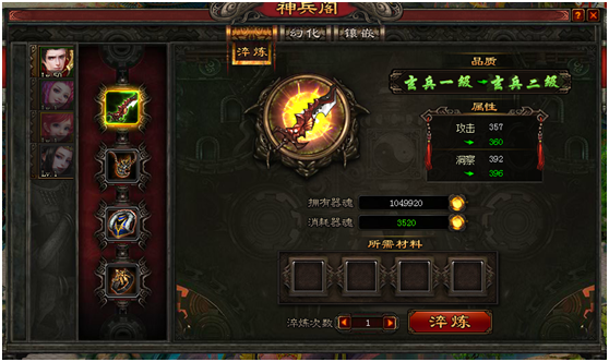 大黑上古降装备强化玩家通过神兵阁进行装备强化,通过消耗器魂和强化材料,增加装备的品质等级。装备的品质等级越高增加的属性越多。