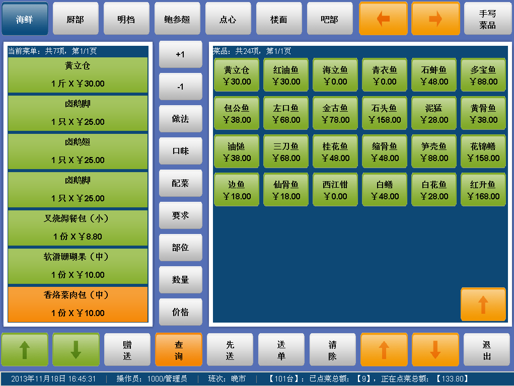 2)服务过程中可随时使用叫起、催菜、加菜、退菜功能为客人服务。