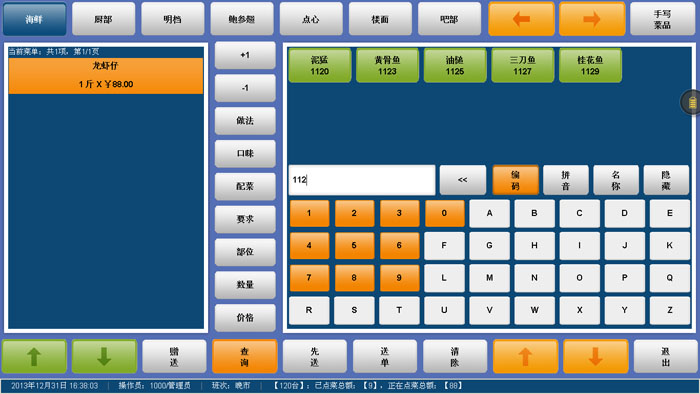1)主界面美观、操作简单、快捷,主要功能在小键盘上即可完成,支持图形点菜、编码点菜、拼音简码点菜,录入方式可自动切换,能极大地提高前台营业的效率。