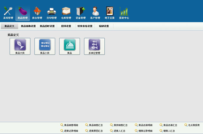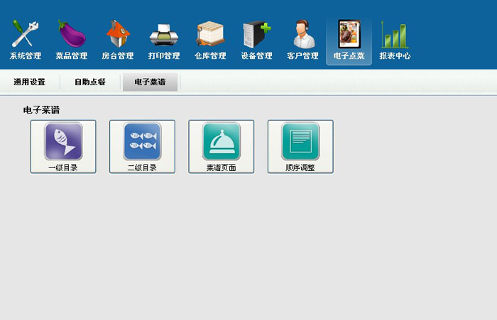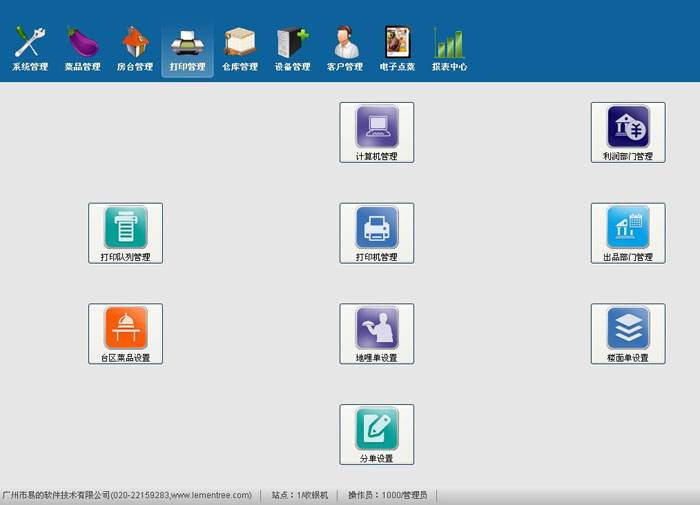 后台模块:系统管理、菜品管理、房台管理、打印管理、仓库管理、设备管理、客户管理、电子点菜、报表中心;