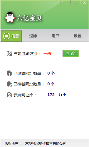 六亿宝贝软件是一款免费的上网环境过滤软件,它可以帮你过滤掉一些浏览网页过程中可能会弹出的一些黄色网站。现在的上网环境脏乱差是很多人都深有体会的了,有时候随便点击个网站都有可能弹出很多垃圾网站,其中不乏一些不健康的内容网站,这些东西让家长们对自己孩子的上网健康感到担忧,这款六亿宝贝软件可以在浏览网页过程中拦截黄色网站还你一个健康干净的上网环境。【软件特点】