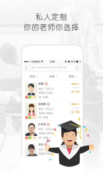 1.找老师:选择[科目、年级、上课地址、日期手机号,教师级别],即可预约上课老师;