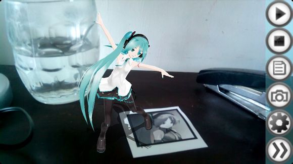 现在有这张图片了,不管是打印还是显示出来的,我们称它为AR卡。打开应用,把相机对着它,就像视频里那样,注意整个黑框要全部出现在相机的图像里一次才行,哈!成功召唤Miku!触摸播放按钮就能看Miku跳舞了。如果看不到Miku,换几个角度对着卡片试试。
