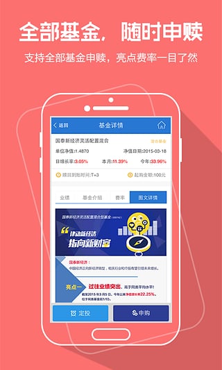 4. 全部基金,随时申赎:手机端支持全部基金的申购和赎回,基金信息详尽呈现,一目了然。