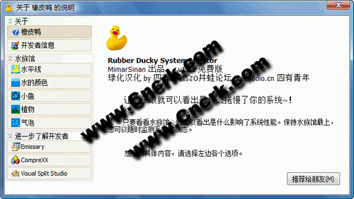 Rubber Ducky V1.11 汉化绿色特别版 人见人爱的Rubber Ducky 橡皮鸭是一款有趣的免费系统检测软件。免费的它以鱼缸的形式出现在系统托盘上。电脑的情况被反映在鱼缸里,其中鱼类代表网络情况,植物代表硬盘,水泡代表CPU使用率,水的颜色和水位代表内存情况。