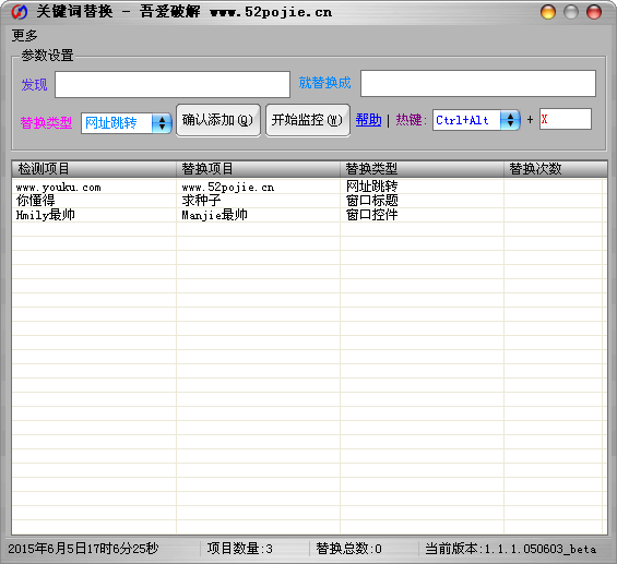关键词替换是一款绿色免费、操作简单的浏览器网址跳转工具。有了这款软件,用户就可以将各种不健康的网站给替换成健康的教育网站,这样孩子在使用电脑的时候就会自动跳过这些不健康的内容,十分方便。后来添加的软件标题和软件控件功能。【软件特点】
