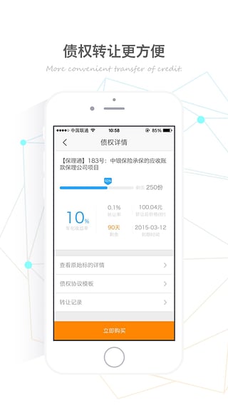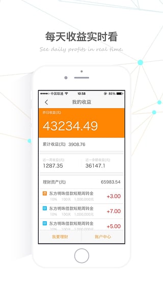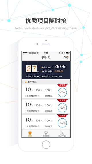 旺财谷,专业的应收账款融资与理财平台,是由南京易投贷金融信息服务有限公司运营的互联网金融F2B平台,以信息撮 合为核心,一端对接有投资理财需求的各类理财者,提供安全、便捷、收益可观的理财产品,一端对接有融资需求的中小微企业,提供专业、便捷、高效的融资渠 道,推动直接融资,践行普惠金融,助力中国实体经济的发展。【软件特点】