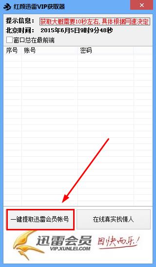 1、下载解压后,直接运行红颜迅雷VIP获取器,点击【一键提取迅雷会员账号】