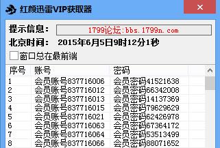 红颜迅雷VIP获取器是一款超级好用的免费防封的迅雷会员账号获取器,这款软件绿色小巧,完全免费使用,而且每天为你及时更新大量的迅雷会员账号,大部分都可以用,如果你占用了某个账号,软件会自动从原有会员列表中剔除该账号,这样可以防止别人登录同一个会员账号把你顶掉的情况,非常人性化!【软件特点】