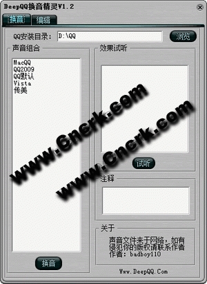 内置多种声音方案,个性化QQ使用。 DeepQQ换音精灵1.2 1.自动判断运行中的QQ安装路径,可手动选择安装路径 2.自动判断QQ版本(08还是09版)支持09版QQ 3.美化界面