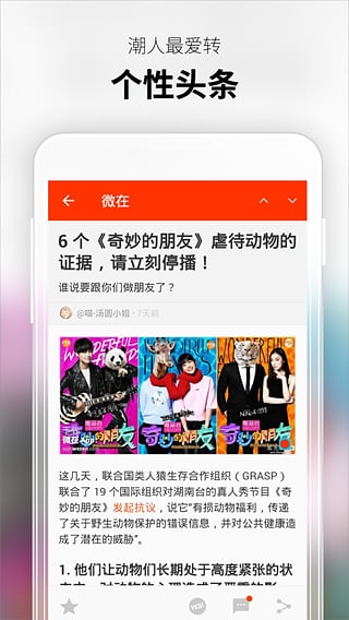 帮助你玩转社交媒体,成为朋友圈里最潮的话题王。每天即时推送最有趣和最具有传播力的新鲜事,提供最个性、最精致、最淘气、最潮的角度,生产让你在朋友圈帅炫酷毙的趣味病毒内容。