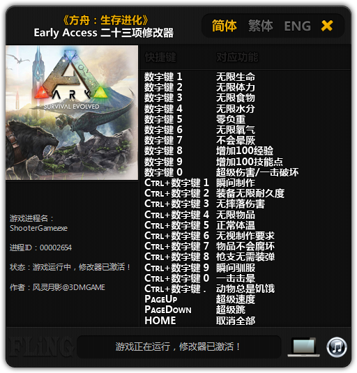 今天这款方舟生存进化二十三项修改器是游戏发售以来功能最为强大额修改器,拥有瞬间驯服,一击击晕,动物总是饥饿、零负重等新功能,需要的朋友赶紧拿走吧,强力推荐哦!