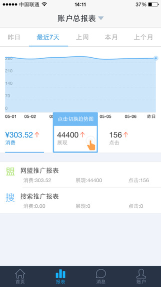 百度推广app一站式管理体验全新的一站式设计体验,统一管理各产品核心功能可以让百度推广人员更灵活的管理自己的营销数据。百度推广app数据服务各产品核心数据、投放趋势,一目了然查看,助您更精准投放,随时掌握移动商机,让即时沟通与商桥留言板无缝对接。