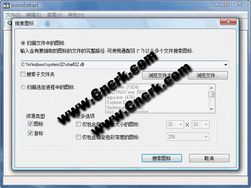 IconsExtract文件小图标抓取工具,将存在于系统中的图片找出来,让您可以另存图文件(*.ico);支持扩展名为 EXE、DLL、OCX、CPL 的程序搜寻