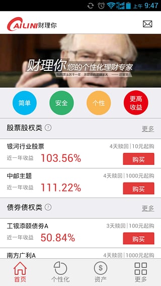 轻松投资理财神器,财理你——您的个性化理财专家,专为解决怎么投和投什么。用户只需输入个人/家庭的收支状况,即可得到一份专业而又通俗易懂的理财规划,既能有效控制理财风险,还能确保更高收益。【软件特点】