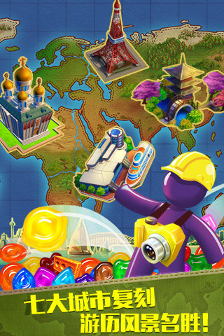 世界旅行《糖糖大世界》作为旅行三消类手游,复刻了世界各国诸多知名城市,如巴黎、伦敦、悉尼、纽约等。每个城市的名胜建筑全部真实还原,玩家可以通过三消关卡[5] 收集不同种类的资源,以资源重建地图上的风景名胜,感受大地图养成玩法。