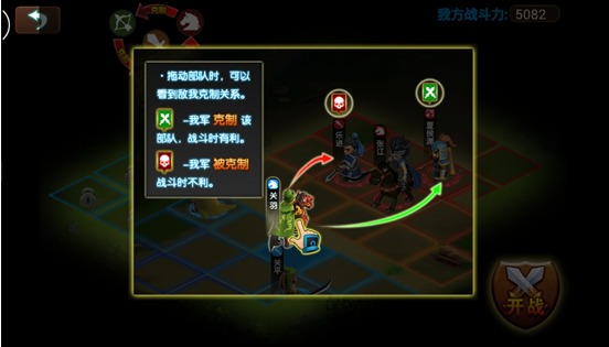 神将奇兵战斗攻是一个比较大的特色,充分体现了战场的多变和策略.主公可不要怕费时间哦!下面就给大家看看阵容是如何搭配的吧,合理的利用兵种相克能叫主公在战场上无往不利百战百胜!看微臣们的安排还算合理吧加载画面都有一些小技巧的提示的,这位主公问了游戏里面会不会有呢?主公!别着急!下面咋们就是游戏里面的提示,看图主公就能看的出来移动位置都有相应的克制提示呀,这下主公不用在为布阵烦恼了!