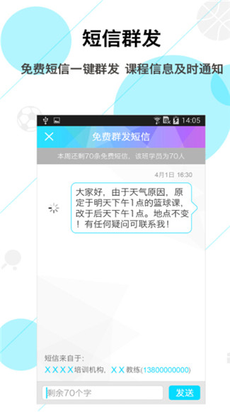 2、新增免费短信功能,教练可以通过教练宝内的免费短信来通知学员具体的课程信息;