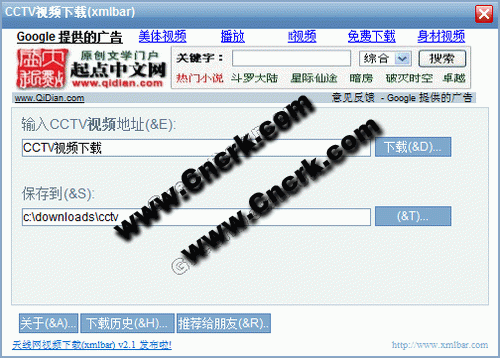 CCTV视频下载(xmlbar) V7.4 简体中文绿色免费版 CCTV视频下载(xmlbar)是一个专门用于下载CCTV视频到本机硬盘上的小软件。它不但完全免费而且不含有任何插件,可以完全干净卸载。用户只需输入需要下载的CCTV视频的观看页面地址并按下获取按钮,或者更方便的使用拖放方法将页面地址从浏览器地址栏拖到本软件的浮动窗口,它就会自动识别后进行下载,下载的文件格式为flv。更好的是它还支持多个CCTV视频文件同时下载,并能显示出真实的CCTV视频文件的下载地址,下载完后您还可以选择马上播放,而且它还有查看管理下载历史记录的功能