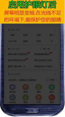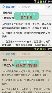 绿色护眼灯专为夜间用手机看小说、看视频、打游戏的熬夜一族打造!简洁小巧、免费下载、永无广告!绿色护眼灯采用特殊算法,过滤屏幕的有害蓝光,同时保证屏幕清晰自然;建议您开机自动启用护眼效果,时刻保护您的眼睛!