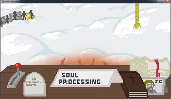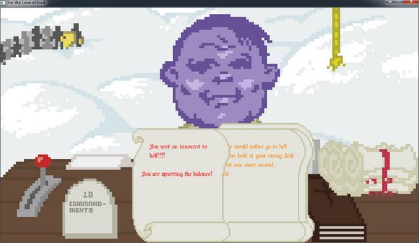 人们将会在你的桌子上探出头来,等待你的判断。玩家可以查看他们递交上来的记述生前言行的卷轴,然后根据《十诫》来检查。如果他们违反了《十诫》, 那么就需要把左边的杆子抬起来把他们送到地狱,无论他们哭得多么厉害或者你多喜欢他们。然而,如果他们严守《十诫》,玩家就可以抬起右边的杆子,允许他们 进入天堂。但这款游戏不仅仅是坐在办公桌前评判别人,玩家在游戏中也同样会由于描述而引起错误,如果无视警告的话,就会被解雇然后下地狱。