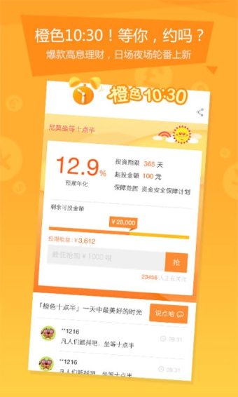 1.全新界面,体验升级:史上最悦目的理财App。2.橙色十点半,APP专享:每天10:30,高息理财计划,超急秒杀。