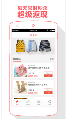 1、限时抢购——淘小仙全天无休,每小时不间断更新。数千款流行单品,人气爆款,价格实惠不仅包邮还返现哦!2、值得买——每日特价,天天包邮,编辑精选,性价比超高,每天商品不断返现不断!