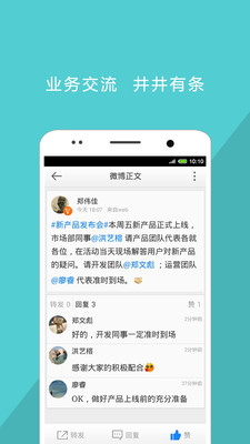 高效沟通:通过企业社交,用户可跨越企业层级与全体同事密切沟通交流,企业透明度大幅度提升;