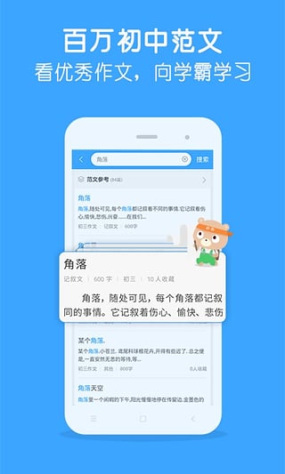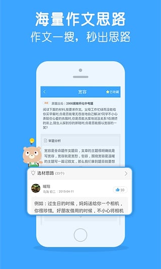 1.海量中小学作文思路: 作文一搜,秒得思路!全网唯一能搜到优质作文思路的中考作文提分神器!2.百万中小学范文: 范文既搜既得,排版精良,支持收藏,写作文作业不再惆怅,语文提分不再愁。