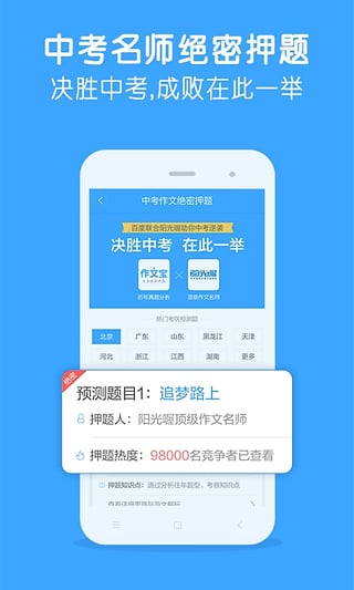 百度出品的中考绝密押题提分神器!内有中考作文快速提分秘籍,用了百度作文宝,中考作文提10分!初中作文不会写,中考作文想提分?搜一下,秒得思路和范文!完全免费,还支持历年中考满分作文大全离线免流量查看!