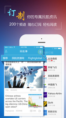 1.订制——你的专属民航资讯,近200个频道,随心订阅,轻松阅读2.读懂——你的心思,点“赞”既是你的关注,个性推荐让我们更懂你