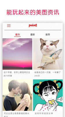 Point美图资讯日报是一款每日向用户推送定量新鲜信息,由用户自行发布观点并且自主互动的的图片资讯类社交软件,由奈特恩数字科技开发,于2015年春节前夕在安卓市场首次上线。【软件特点】