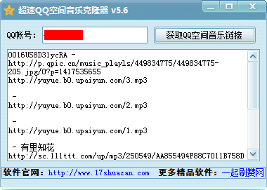 打开软件之后,输入你喜欢的QQ空间的QQ账号,然后,点击获取QQ空间音乐链接,在下方的显示框中就会显示出所有的QQ空间音乐的所有链接地址,如下图所示;