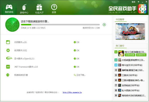 4.用户确定后,程序会重新检测系统,并自动下载、安装游戏引擎。