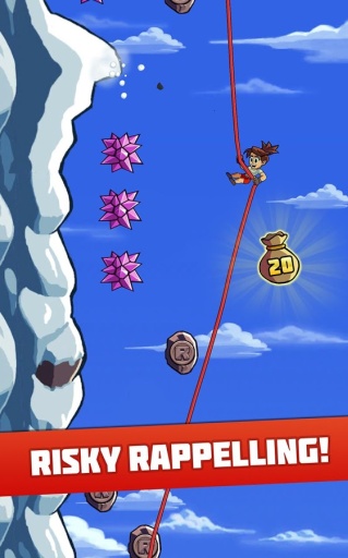 《激进速降 Radical Rappelling》是一款玩法新颖的敏捷动作游戏,这款游戏的灵感来自于一项极限运动——绳索速降,在游戏中有的场景同现实一样,玩家从山顶利用绳索不断先下降落,按住屏幕即可自动下降,但是如果不小心踩到带刺的水晶的话就会阵亡,是是不是很有意思,感兴趣的玩家可以下载挑战一下,看你能速降多远吧。【游戏特点】