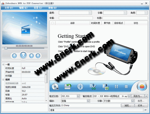 Joboshare DVD to PSP Converter可以帮助您将各种格式的DVD视频光盘转换为AVI, MPEG, WMV, DivX, RM, MP4, MPEG-4 AVC, PSP MPEG-4 AVC, MP3, WAV, WMA, AAC, M4A, MP2等各种主流音视频格式。您可以将转换的音视频导入PSP、PS3等各种数码设备,让您在汽车中、地铁里轻松享受家庭影院般的DVD电影效果