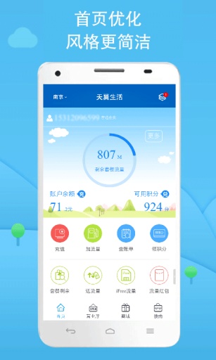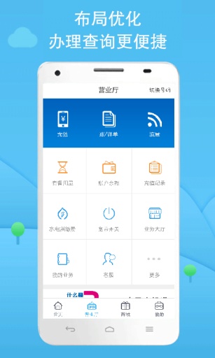 1、基础功能:话费查询、套餐剩余查询、账单查询、充值交费、积分查询兑换、业务办理及更换等。2、特色功能及优惠活动:充值享优惠,流量半价抢、分享得流量、签到送积分等各类主题促销活动。