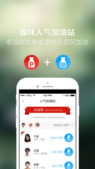 3、游戏式观看体验——趣味人气加油站,边看视频边收集能量瓶给居民加油。