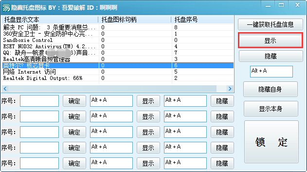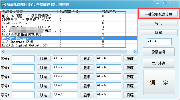 吾爱隐藏托盘图标工具绿色版下载,吾爱隐藏托盘图标工具是一款托盘图标隐藏软件,它可以帮你获取桌面托盘所有的图标信息,并对图标进行管理,支持图标的隐藏、显示、锁定等管理功能,还支持自定义设置隐藏指定图标的快捷键,让您随意更改您的托盘图标。【吾爱隐藏托盘图标工具使用方法】