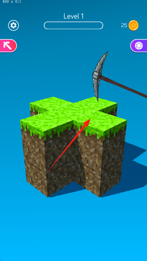 1. 在Level1开展矿石挖掘工作,使用铁镐工具,点击绿色草地上的方块,接着启动挖掘流程,逐层破除土壤层。