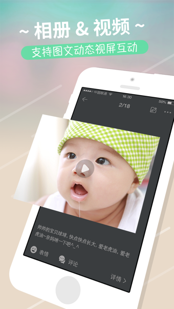 【图文相册】照片、视频、文字,多种记录形式,可以批量导入、导出照片【安全云储】强大云存储功能,再也不担心宝宝照片丢失啦,海量空间,随时随地上传下载,多重防护,安全私密。